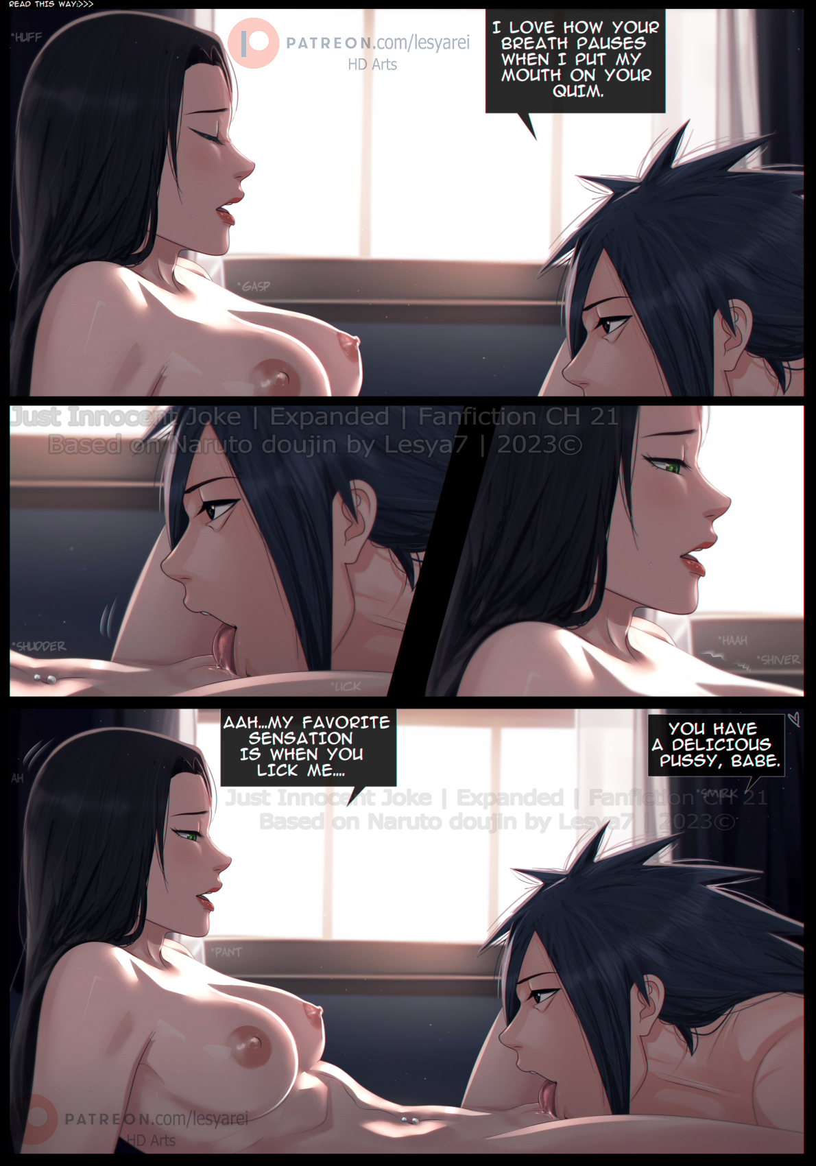 💭 Madara's mind. As I lower myself between her soft, creamy thighs, I hear her take a sharp breath. When my tongue touches her sensitive flesh, she arches up and releases a low moan that sends shivers down my spine. Under the caress of my tongue, Haruko writhes. Her fingers graze through my hair as she gyrates against me in ecstasy, urging me on. She's vocal in her appreciation, and each gasp and chunter from her lips spurs me to explore further. The scent of her arousal fills my nostrils, and the sound of her exaltation ignites every nerve ending in my body. As I delve deeper into her embrace, the world melts away until there's only us in this instance of pure bliss. Her sweet voice fills the room, ringing off the walls and heightening our desire.