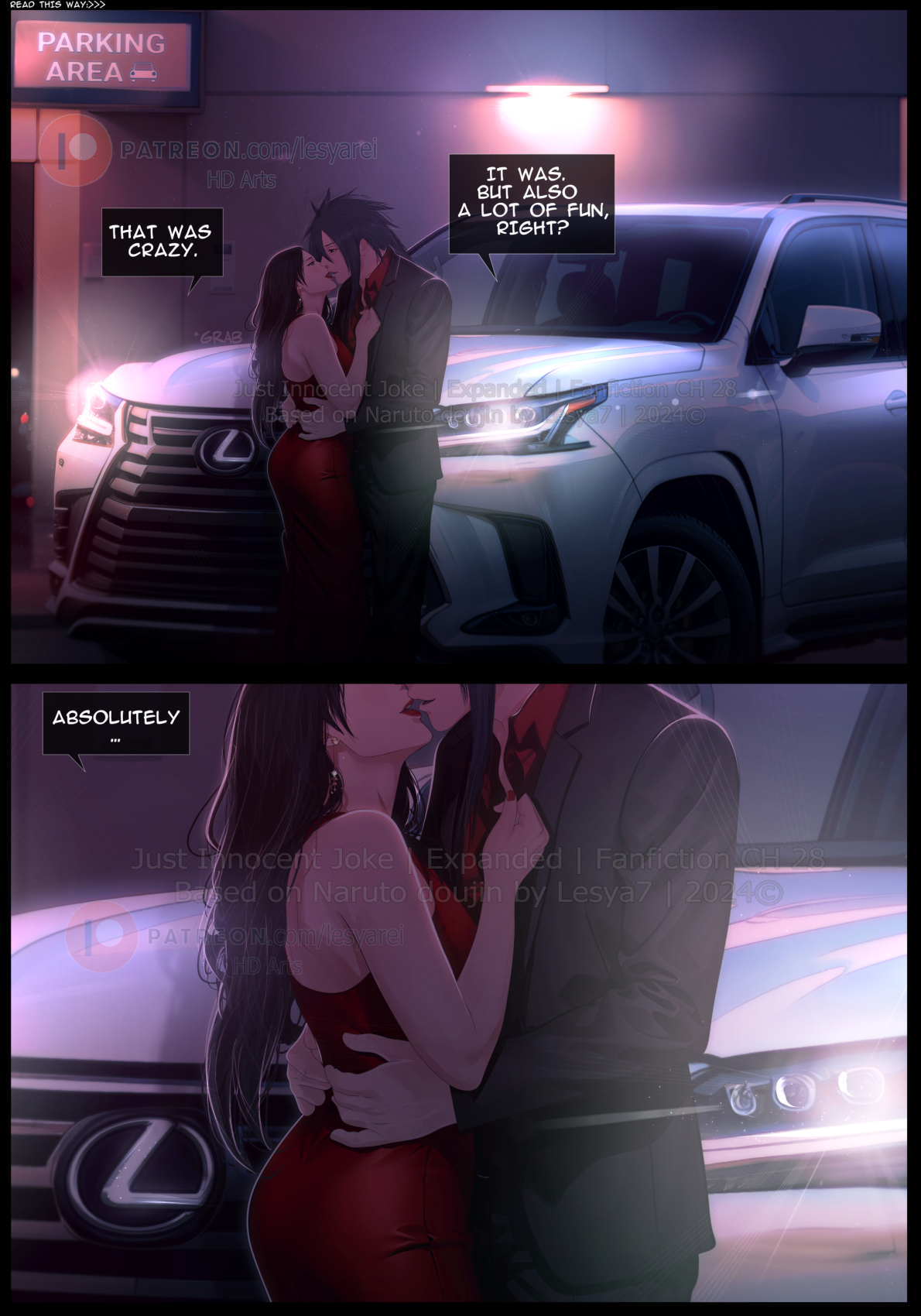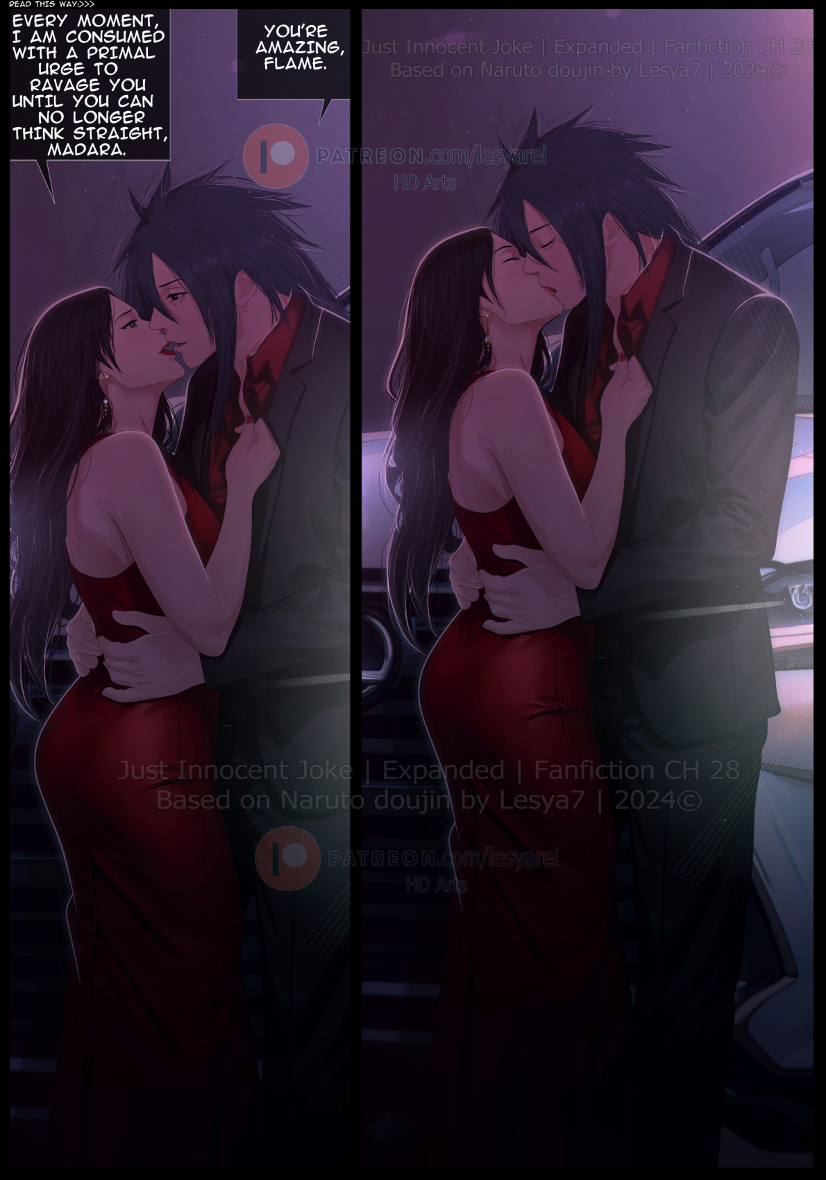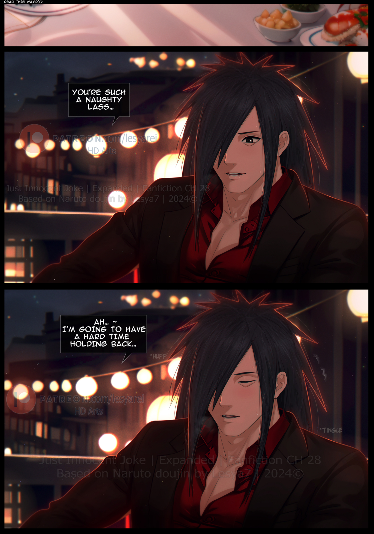 Our lips melted together as we lost ourselves in each other's touch. When we finally parted, we were both left breathless. But before I could catch my breath, Haruko whispered, "You know I can make this evening even more exciting for you, Madara." Her hand slid down from my neck to my collar, unbuttoning one clasp of my shirt before pulling away with a seductive bite of her lip. "Before we leave this place, I have something dirty in mind..."